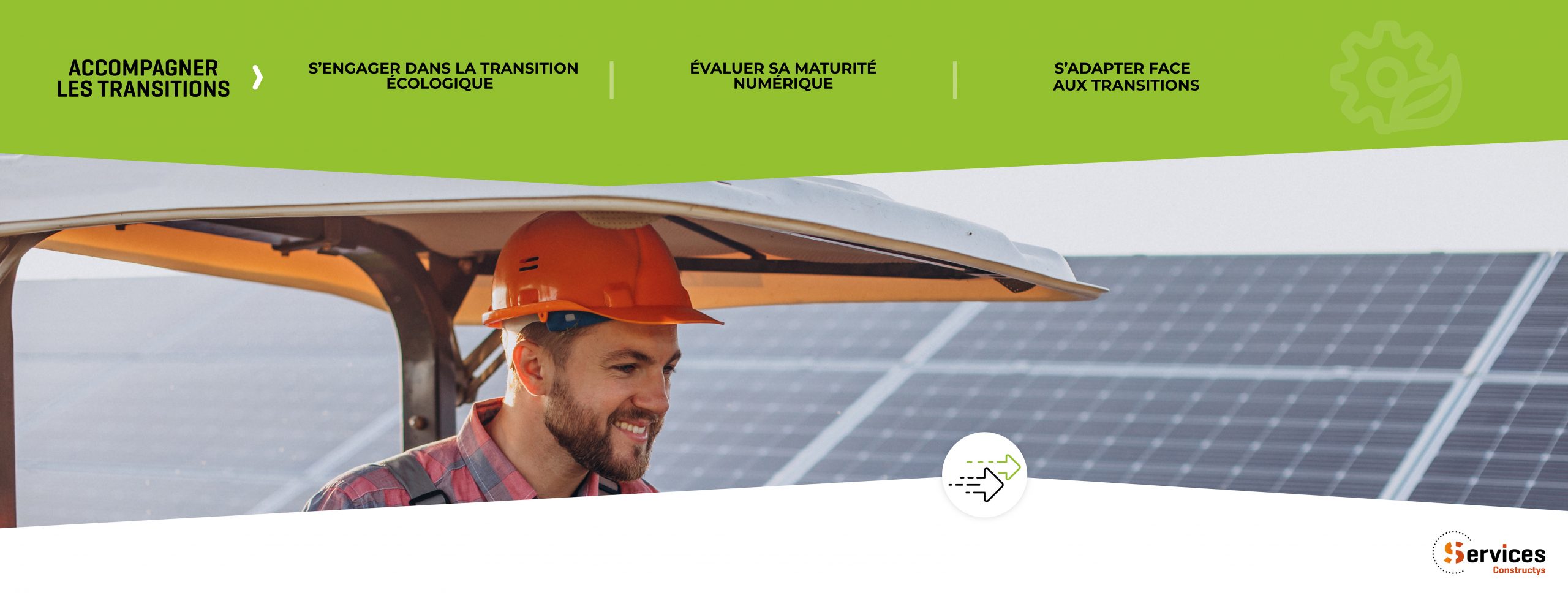 L’offre de services « accompagner les transitions » a pour objectif d’aider les entreprises de la construction en leur proposant des outils de sensibilisation et de diagnostics sur les transitions écologique, numérique et RH, de les accompagner dans l’adaptation de leur entreprise et de leur mettre à disposition le recensement de l’offre de formation et les financements associés.