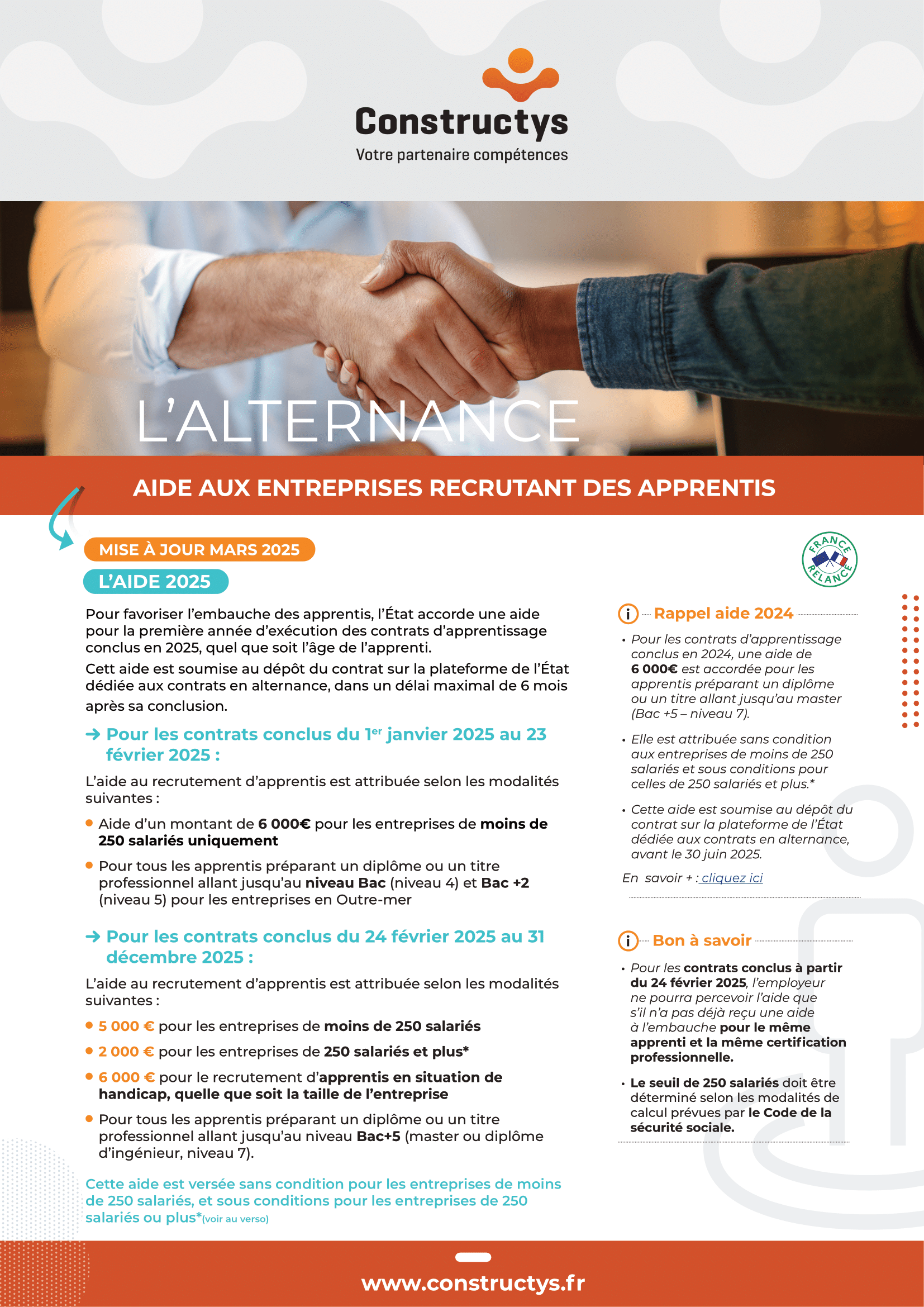 Cette aide est versée aux entreprises, pour les contrats conclus avec un alternant du 24 février 2025 au 31 décembre 2025, pour la première année d’exécution du contrat.