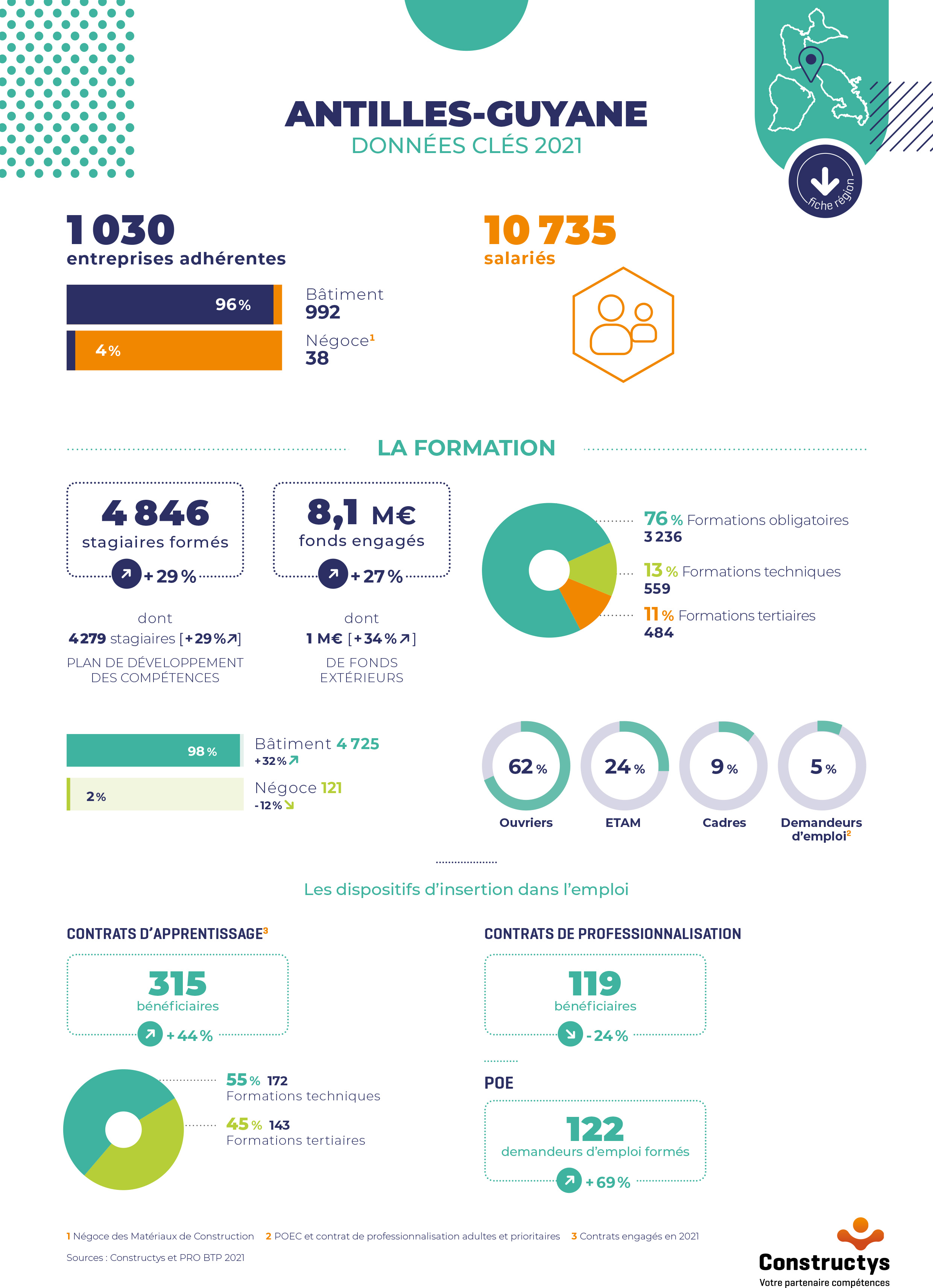 Constructys accompagne en Antilles-Guyane 1 030 entreprises adhérentes, dans leurs projets de développement des compétences, et sur leurs problématiques emploi / formation. En 2021, Constructys a financé 8,1 M€ pour accompagner le départ en formation de 4 846 stagiaires.
