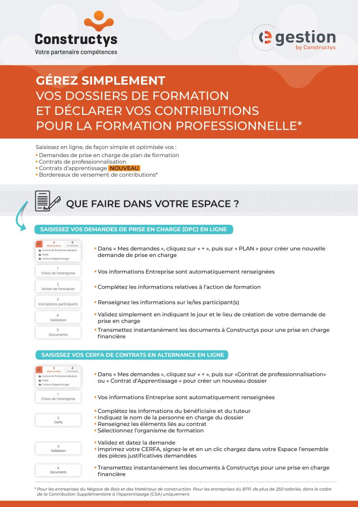 Grâce à e-Gestion, votre espace entreprise par Constructys est à portée de main. e-Gestion vous garantit un accès rapide et une gestion plus simple et efficace de vos dossiers de formation.