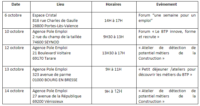 Pour encourager cette dynamique, informer et répondre aux questions des demandeurs d’emploi, un conseiller Constructys sera présent lors des différents évènements organisés sur la région Auvergne-Rhône-Alpes :