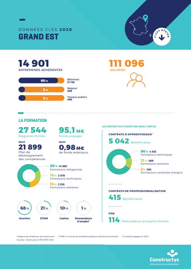 Constructys accompagne en Grand Est 14 901 entreprises adhérentes, dans leurs projets de développement des compétences, et sur leurs problématiques emploi / formation. En 2020, Constructys a financé 95,1 M€ pour accompagner le départ en formation de 27 544 stagiaires.