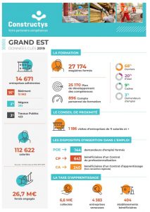En Grand Est, Constructys accompagne ses 14 671 entreprises adhérentes, dans leurs projets de développement des compétences, et sur leurs problématiques emploi / formation. En 2019, Constructys a financé 26,7 M€ pour accompagner le départ en formation de 27 174 stagiaires. Retrouvez toutes les données clés 2019 et découvrez l’action « HOPE » mise en place pour faciliter l’insertion par le travail de 10 personnes réfugiées dans le secteur de la Construction.