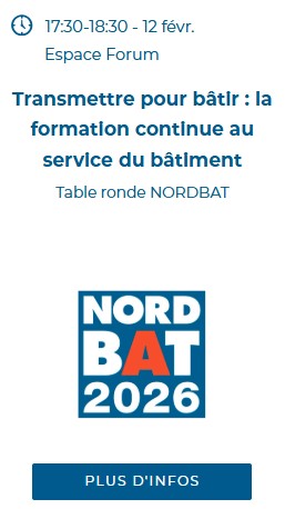 Constructys Hauts-de-France sera présent au salon NORDBAT 2026 : rendez-vous les 11,12 et 13 février 2026 à Lille Grand Palais.
