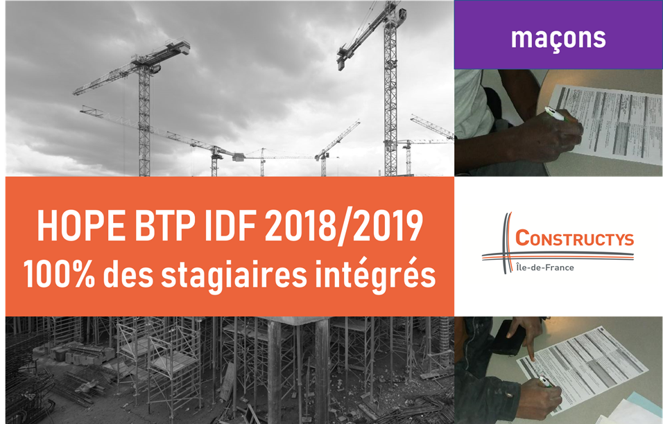 Sous l’impulsion de la Fédération Française du Bâtiment Ile-de-France Est, Constructys Ile de France et l’AFPA ont déployé un parcours de formation ambitieux, dans le cadre du dispositif HOPE : une formation à visée linguistique, axée sur le métier de maçon de 3 mois, suivie d’un contrat de professionnalisation de 6 mois débouchant sur la mise en place de deux CCP du titre professionnel « Maçon » .