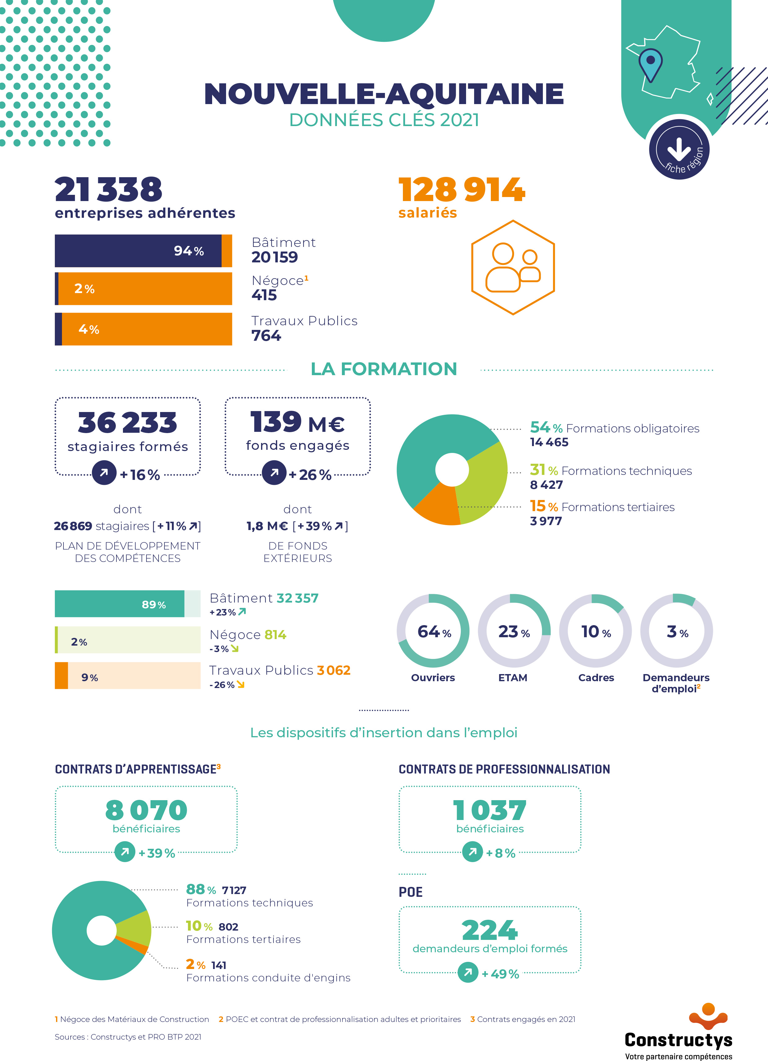 Constructys accompagne en Nouvelle-Aquitaine 21 338 entreprises adhérentes, dans leurs projets de développement des compétences, et sur leurs problématiques emploi / formation. En 2021, Constructys a financé 139 M€ pour accompagner le départ en formation de 36 233 stagiaires.