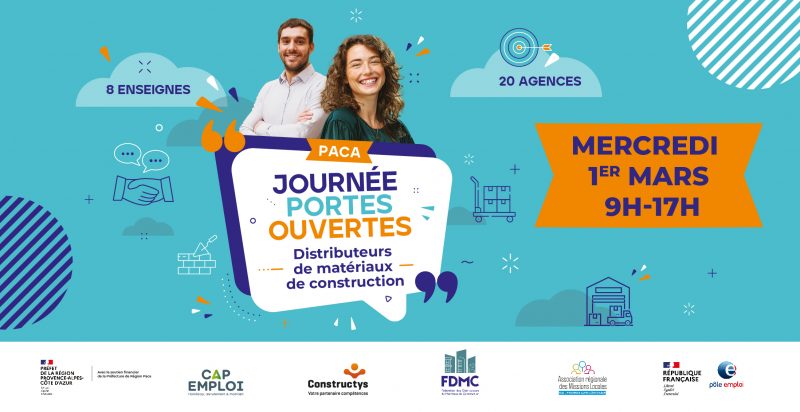 En région Paca, Constructys, Opérateur de compétences de la Construction, et la Fédération des Distributeurs de Matériaux de Construction (FDMC), organisent le mercredi 1 mars 2023, une journée portes ouvertes, dédiée aux métiers des distributeurs de matériaux de construction, à destination des demandeurs d’emploi.